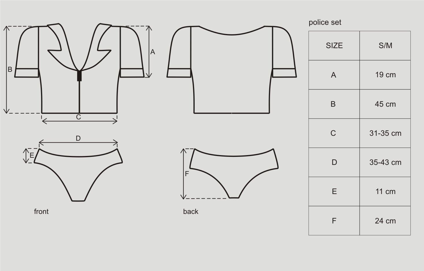 Костюм секси полицайка. Блузата е с яка, маншети и джоб на гърдите. На единия ръкав и гърдата има емблема и думата Полиция. Гащичките са добре профилирани, за да подчертават бедрата. Каишът може да се използва за връзване,. Комплектът включва също и шапка.